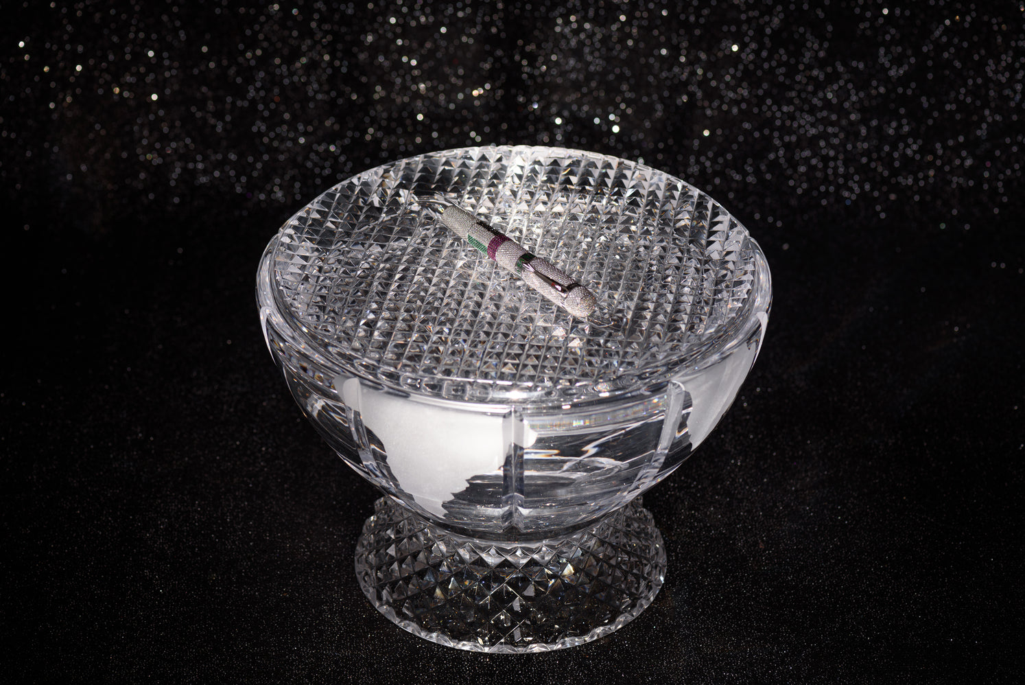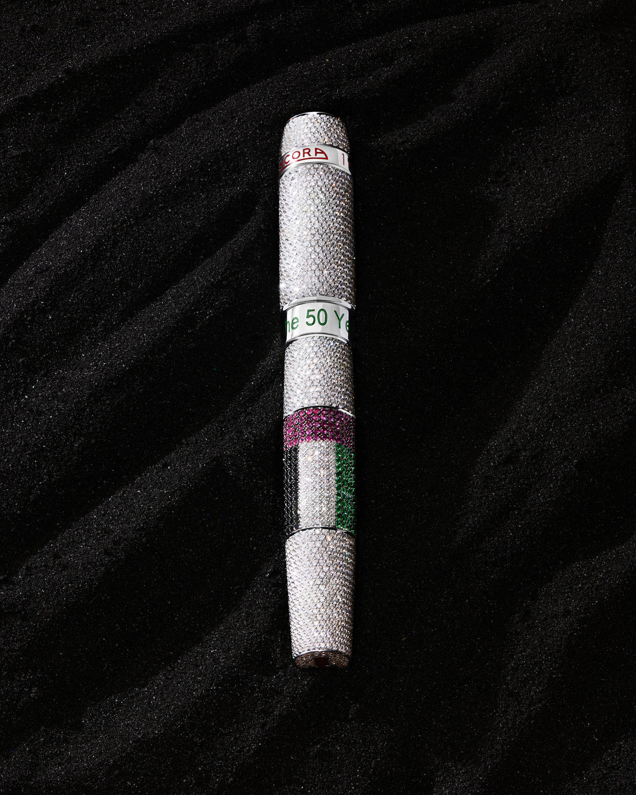 The Ancora Unique One-of-One Diamond Pen celebrates the golden jubilee of the United Arab Emirates with unmatched grandeur. Housed in a monumental crystal globe shaped like the Earth, this pen is more than a writing tool—it's a symbol of legacy, unity, and prestige. The UAE flag, masterfully recreated in black diamonds, rubies, emeralds, and white diamonds, crowns the design with resplendent patriotism and precision. Each gemstone has been individually selected and hand-set, honoring the craftsmanship and artistry synonymous with Ancora.